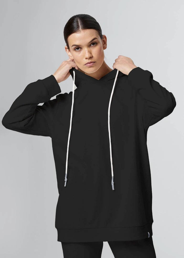 Varley Fink Sweater is the perfect oversized hoodie. Some days call for the comfort only an oversized hoodie and leggings can provide. The Fink Sweatshirt from Varley knows what you need and is here for you time and time again. This longline hooded sweatshirt features extra-long wax-dipped drawcords adding a touch of interest. The color is not a true black but instead has a more broken-in-washed feel to the fabric. We love it with a pair of bike shorts and sneakers.